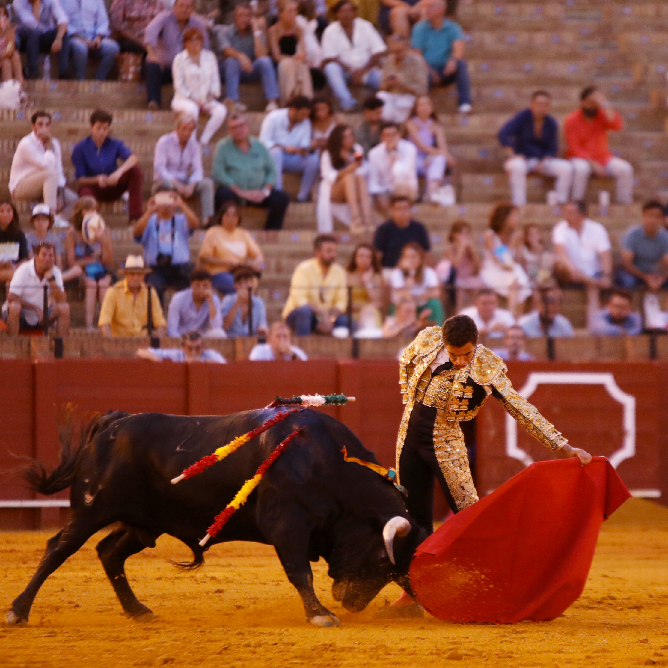 Emiliano Ortega, de México, cayó de pie en su presentación sevillana. Lidió un novillo, el tercero, que propinó una seria voltereta a Nek Romero en su turno de quites. Brindó al gran banderillero sevillano Rafael Torres antes de emplearse en una larga labor en la que mostró compostura y buenas maneras, además de los resortes necesarios para resolver los defectos del ejemplar de Lora Sangrán. Mató bien y pronto y se le concedió la primera oreja del festejo.