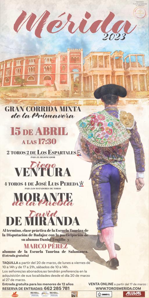 El empresario ha señalado que “Mérida se convierte en una plaza que apuesta por renovar ilusiones donde se conjuga lo contemporáneo y lo venidero. Unimos el próximo 15 de abril, todos los aspectos de la tauromaquia en un solo cartel y con una política de precios para todos los bolsillos con especial atención a los jóvenes. Las entradas ya están a la venta de forma online en nuestra web www.torospereda.com”.