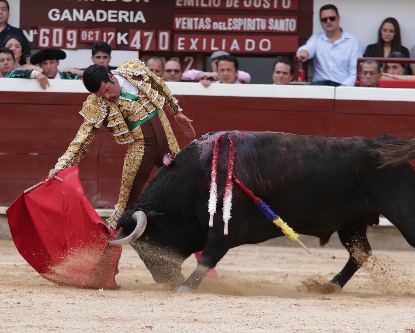 Virtudes y defectos tuvo el quinto de la tarde. Un animal al que faltó recorrido y transmisión, algo que tuvo que poner Bolívar, pero que también contó con fijeza y que metió la cabeza en la muleta con cierta bondad, incluso, clase. El número uno del toreo colombiano no escatimó y quiso mucho desde que se abrió de capote. Trató de ahormar su condición y de entregarse delante de sus paisanos. Se echó de rodillas en busca de ese interés del público y siempre provocó y alegró sus embestidas con la voz. Mandón con la diestra, destacaron del conjunto naturales de muy buena factura. Era de premios, pero marró con el acero y todo quedó en silencio tras aviso.