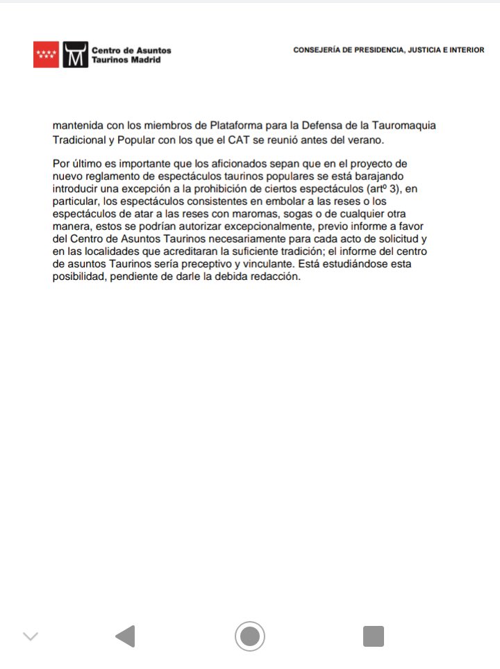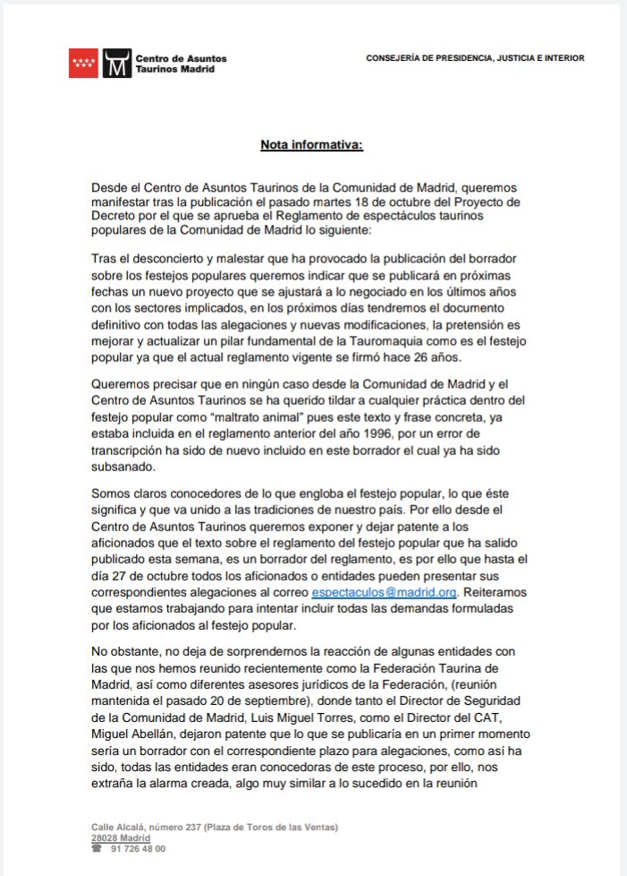 Añade que «desde el Centro de Asuntos Taurinos queremos exponer y dejar patente a los aficionados que el texto sobre el reglamento del festejo popular que ha salido publicado esta semana, es un borrador del reglamento, es por ello que hasta el día 27 de octubre todos los aficionados o entidades puede presentar sus correspondientes alegaciones al correo espectaculos@madrid.org. Reiteramos que estamos trabajando para intentar incluir todas las demandas formuladas por los aficionados al festejo popular».