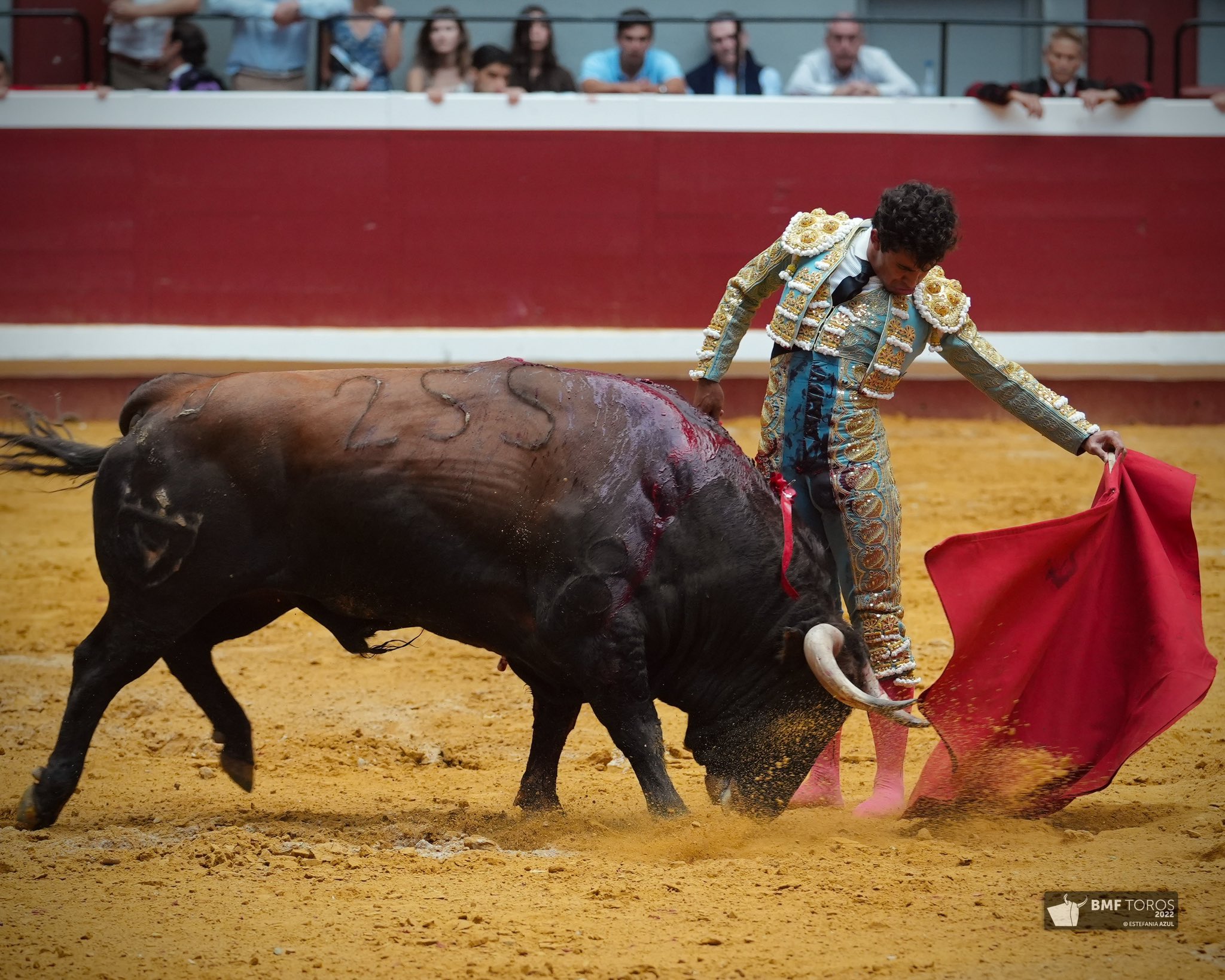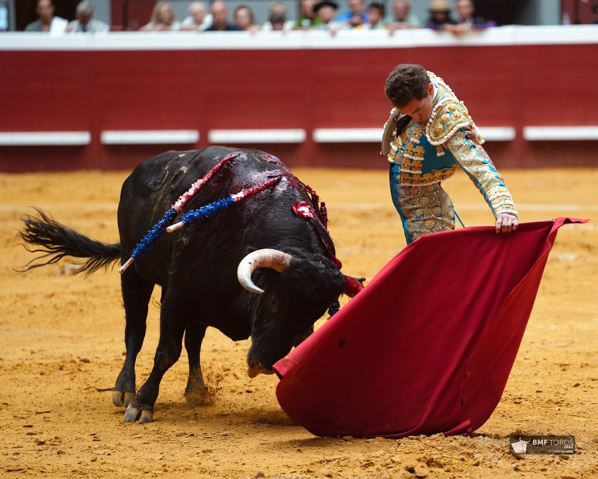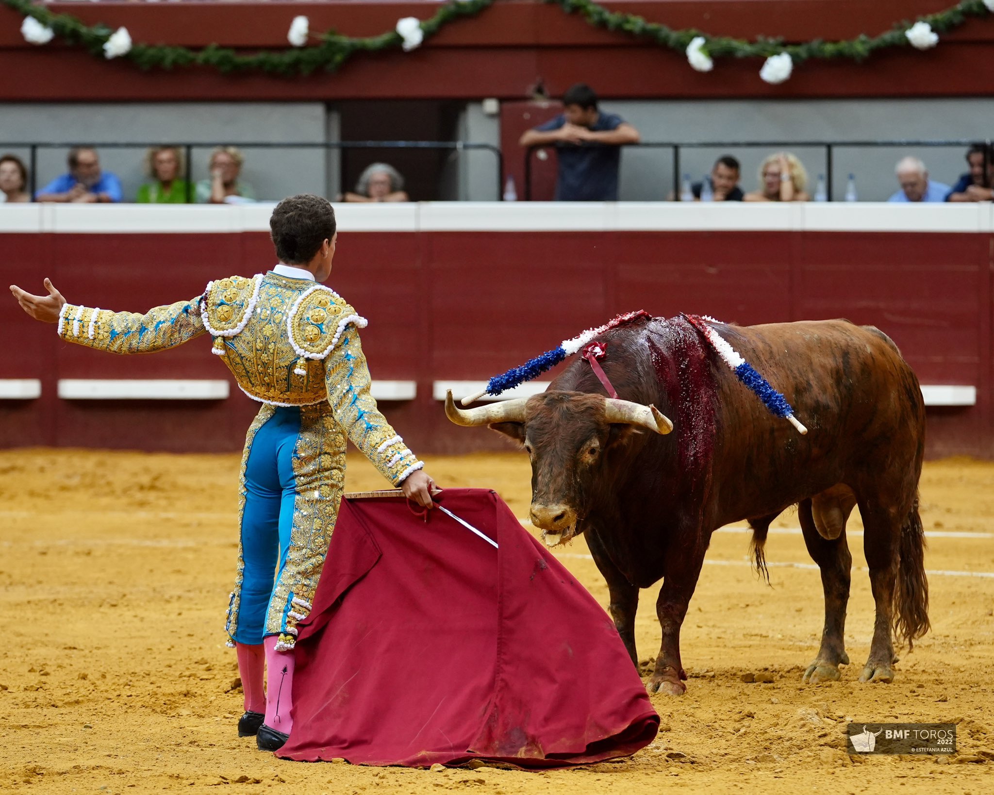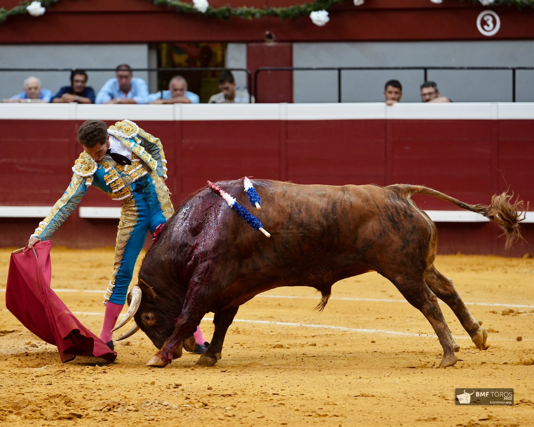 Ginés Marín (de azul pavo y oro), oreja y vuelta al ruedo.